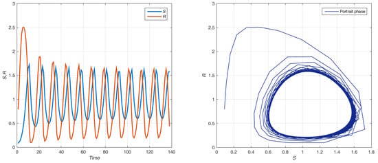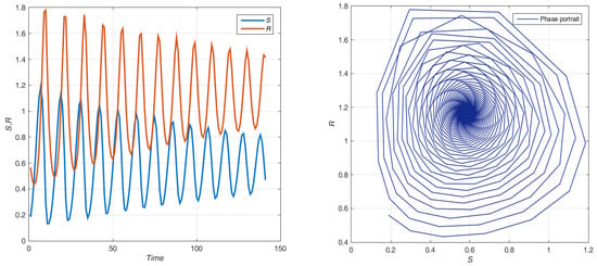 Time series and phase portrait of the interaction when a limit cycle arises around the steady state equilibrium for S(0) = 0.09; R(0) = 0.8; α = 0.85; a1 = 0.77; a2 = 0.18; a3 = 0.088; b1 = 0.5329; β = 2.09; b2 = 0.0831; and N = 6.