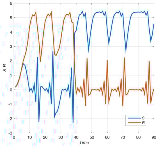 Time series of the interaction when the steady state equilibrium is unstable, and the positive solution exhibits chaotic behavior for S(0) = 0.218; R(0) = 0.19; α = 1.8; a1 = 0.45; a2 = 0.3; a3 = 0.02; b1 = 0.27; β = 1.854; b2 = 0.03; and N = 14.