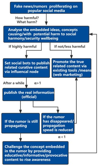 In Figure 5, increases views at high speeds because of ’s weakness in attracting people with α = 0.8. However, manages to make its way back in the competition in the end and gets the community’s attention. This suggests strengthening the relative real or true information at the expense of propagating rumors and fake news. Social media platforms and authorities could use social bots to improve the presence of related true or verified information and content, which is , on the platform via existing tools and methods, such as rankings or web marketing, etc. Therefore, in the future, social bots can be used to produce new content or refresh positive circulating and become the norm in disseminating high-credibility information. Of course, automated authoring is not only about turning data into information and then publishing it, but it should particularly be about making machines as an extension of humans. This also means that we should give full play to the dual advantages of social bots (artificial intelligence) and manual (human intelligence) review, eliminate management lag brought about by the rapid development of artificial intelligence, and ensure the sustainable development of social networks (ecosystem).