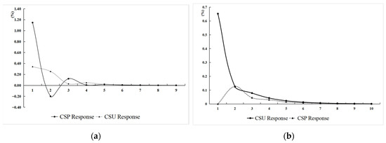 Figure 3a,b show the dynamic response process of Beijing’s own two variables after adding a unit standard deviation positive shock to CSP and CSU, respectively. When a positive unit standard deviation was applied to the CSP of Beijing, the CSP showed an initial positive response in period 1, followed by a negative response in period 2. Subsequently, CSP experiences a small increase and again becomes positive, after which it converges to zero during the fluctuation starting in period 4. However, when a positive unit standard deviation shock is applied to the CSU, the shock effect initially leads to an increase in the CSU. However, the effect gradually diminishes and eventually converges to zero during the fluctuation. Additionally, the CSP response to a positive unit standard deviation shock from the CSU initially rises and peaks in period 2 before beginning to fall, and gradually decays to zero from period 7.