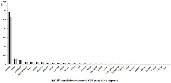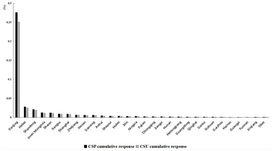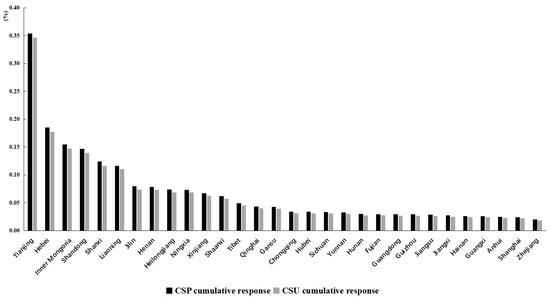 The cumulative effects of positive shocks from the Beijing CSP and CSU unit standard deviations stabilized (10 periods) are shown in Figure 4 and Figure 5 for each province. Overall, the cumulative effect of positive shocks to CSP or CSU unit standard deviation from Beijing on CSP and CSU is positive in all provinces, and the cumulative impact on CSP in other provinces is generally higher than that on CSU, suggesting that increased consumption capacity or consumption upgrading in Beijing is more likely to drive the growth of consumption capacity in neighboring provinces. The five most significantly affected provinces and cities are Tianjin, Hebei, Inner Mongolia, Shandong, and Shanxi. The continuous deepening of the Beijing–Tianjin–Hebei cooperative development has accelerated the integration of market sharing, consumption imitation, cross-regional consumption, and policy incentives between them. The economic interaction between the regions has become closer, with consumption capacity and consumption upgrading between the regions influencing and interacting with each other, thus giving Beijing a strong spatial spillover to Tianjin and Hebei. Although Inner Mongolia, Shandong, and Shanxi are geographically distant from Beijing, the increasing improvement of inter-regional transport and communication infrastructure has led to closer spatial links between people, material, and information flows across the region. The integration of income, consumption interactions, and consumption attitudes and patterns between Beijing and the neighboring provinces has continued to penetrate, thus allowing Beijing to exert a greater influence on these three provinces as well.