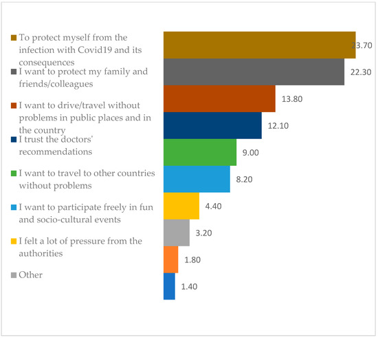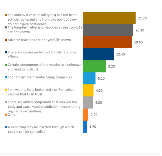 Although 63.4% of respondents from our study agreed that vaccination is an extremely effective method for boosting immunity, vaccination is not a widely accepted practice. The vaccination acceptance rate is consistent with the statistics revealed in previous studies, which indicate a global percentage of 71.5%, ranging from 90% in China to 55% in Russia [19]. Within this broader context, 65.2% of Romanian respondents reported being immunized against COVID-19. The percentage is higher than that found in other European countries such as Poland (56.31%) [19] and France (58.89%) [19], but it should be noted that 89.9% of respondents in our study declared a medium or high level of medical knowledge. This high level of knowledge could explain why the vaccination acceptance rate is higher in our study group than in other European countries. The percentage of respondents who approve of immunization against COVID-19 varies not only from country to country or across occupational groups [20], but also with the length of time since the vaccine’s introduction into medical practice. The reasons for refusing vaccination against COVID-19 also change over time [21]. It is worth noting that at the time of survey completion (October–December 2021), 10.2% of respondents were also vaccinated with the influenza vaccine for the 2021–2022 season, even though no negative influence was detected and there were no safety concerns regarding co-administration [22]. The results of an investigation into the explanations for COVID-19 vaccination refusal for our subjects is reported in Figure 1.