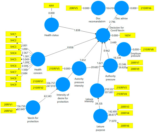 Using the SmartPLS program, we have calculated the correlation between the latent variables based on the data presented in Table A3 from Appendix A. In some cases, based on the correlation coefficient, there are fairly robust correlations between the proposed constructions. Correlation analysis between latent variables reveals relationships that cannot be directly observed or measured. If we correlate these latent variables with other observable variables, we can infer the values of the latent variables from the observations of the observable variables. The analysis of the correlation between the latent variables reveals that there is a strong latent link between the criteria underlying the evaluation of non-vaccination or vaccination and variables such as information about vaccine (0.886), non-vaccination reasons (0.810), and vaccination for health (0.833), whereas there is a weaker latent link between the expectations related to the vaccine as a product and the criteria underlying the evaluation of non-vaccination (0.494) or the denial (Table A3 in Appendix A).
