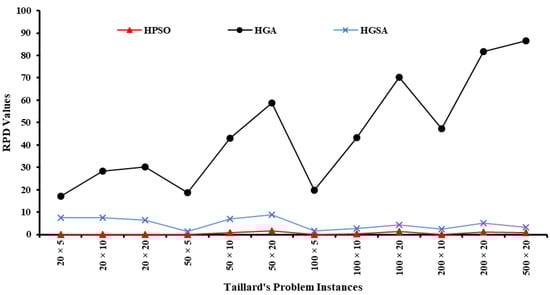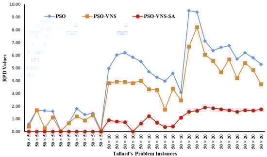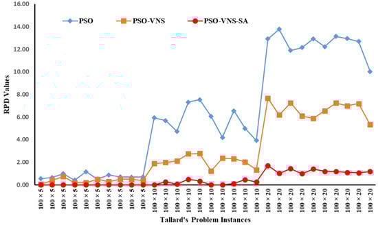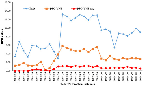 Performance comparison of the RPD values of the three PSO algorithms for the 200- and 500-Job Taillard’s instances.