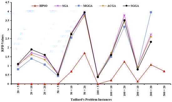 Comparisons were also carried out with four different versions of GA, i.e., SGA (Simple Genetic Algorithm) [], MGGA (Mining Gene Genetic Algorithm) [], ACGA (Artificial Chromosome with Genetic Algorithm) [], and SGGA (Self-Guided Genetic Algorithm) [], as presented in Figure 7. The deviation of the GA from the upper bound, which increases in magnitude with the increasing problem size, was significantly more than HPSO. Thus, it can be concluded that the algorithm developed during this research is comparatively more robust and performs better than other hybrid GA techniques even while handling larger problem sizes.