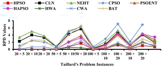 Once the internal comparison of HPSO with standard PSO, PSO-VNS, and validation against HGA and HGSA was completed, the last part of validation was against other notable techniques already reported in the literature. For this purpose, a more detailed comparison was carried out with WOA [], Chaotic Whale Optimization (CWA) [], the BAT-algorithm [], NEHT (NEH algorithm together with the improvement presented by Taillard) [], ACO [], CPSO (Combinatorial PSO) [], PSOENT (PSO with Expanding Neighborhood Topology) [], and HAPSO (Hybrid Adaptive PSO) []. This comparison was solely based on ARPD values and is shown in Table 6 and graphically illustrated in Figure 8. The improved performance of HPSO, developed during this research, is evident as compared to other reported hybrid heuristics.