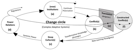 Learning from social construction theories [,], one possible strategy for such an intervention is to play with controversies in social systems, particularly conflicts, tensions, or any form of disagreement [,,]. Controversies are an inseparable part of social systems; they can improve and stimulate the self-organizing capacity of social systems [,]. Controversies between actors can act as a silver bullet or social catalyst that can facilitate destabilization, change, and growth from underlying social structures []. In other words, controversies have a transformative mechanism that, if constructed, can create the precondition for change on the mindset and paradigm level [,]. To construct controversies, the requisite is to aggregate a network of adaptive agents, and it is recommended to make this process purposeful using an action-oriented discipline [,]. One benefit of an action-oriented approach is to improve and facilitate aggregating a network of actors and creating the precondition for continued adaptation. In doing this, a call for the involvement of a pragmatic and creative approach is needed; thus, a systemic concept is embedded in the core concept of designing [].