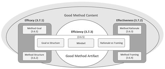 As mentioned in Section 2.2, the interviews started with an open question that required experts’ opinions on what they see as the central goal of this method and how they see the structure (refers to the links and connections between different parts—Section 3.6.2). Our focus was on the quality of the method goal, such as the ease of understanding, the relevance, and the reliability, and about the quality of structure, our focus was on the timeliness, complexity, and reliability of the structure. In case of a negative response, the interviewees were asked to elaborate on their responses and give suggestions on how to improve one part of the method. Figure 2 is a visual representation of the interview process, originally developed by J. Daalhuizen (known as the method content theory) and adapted in this paper in order to ease the content analysis [].