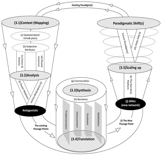 The last part is the scaling-up process, aiming to disseminate the results of the translation process. The outcomes of the translation, in particular, a new network of allies, new knowledge, and experience, have to be scaled up from a community level (the translation phase) to a broader social scale, as shown in (Table 5) []. In other words, only through a scale-up process one can claim that the translation has ideally changed the main paradigm of a social system.
