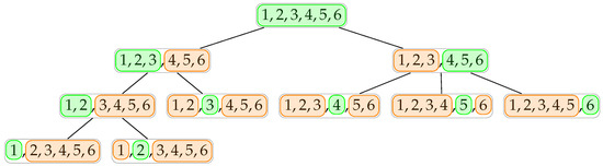 As for the first step, each agent t divides the primary objective hyperparameter set of the query it receives, i.e., , into a number of subsets, for each of which the system initiates a new agent to handle. This process continues recursively until there is only one hyperparameter in the primary objective set, i.e., , which is assigned to a terminal agent. Figure 1 provides an example hierarchy resulting from the recursive division of the primary objective set . For the sake of clarity, we have used the indexes of the hyperparameters as the labels of the nodes in the hierarchy, and the green and orange colors are employed to highlight the members of the and sets, respectively. Regarding the maximum number of concurrent connections that the agents can handle in this example, it is assumed for all agents that , except for the rightmost agent in the second level of the hierarchy, for which . It is worth emphasizing that at the beginning of the process, when the tuning query is received from the user, we have and , which is the reason for the all-green node of the root node in this example.
