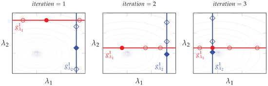 To better understand the suggested collaborative randomized tuning process of agents, an illustrative example is depicted in Figure 2. In this figure, each agent is represented by a different color, and the best candidate that each agent finds at the end of each iteration is shown by a filled shape. Moreover, we have assumed that the value of the loss function becomes smaller as we move inwards in the depicted contour lines, and to prevent any exploration in the domain of the subsidiary hyperparameters, we have set and for agents and , respectively, assuming that the domain size of each hyperparameter is 1 and . In Iteration 1, both agents start at the top right corner of the search space and are able to find candidates that yield lower loss function values than the starting coordinate. For iteration 2, the starting coordinate of each agent is set to the coordinate of the best candidate found by all agents in the previous iteration. As the best candidate was found by agent , we only see the change in the searching direction of the red agent, i.e., . The winner agent at the end of this iteration is agent ; hence, we do not see any change to its searching direction in iteration 3. Please note that the four circles for agent in the last depicted iteration is because it shows the starting coordinate, which happens to remain the best candidate in this iteration. It is also worth emphasizing that the starting coordinates are not evaluated again by the agents, as they have already been accompanied by their corresponding response values from the previous iterations.