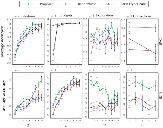 For the iterations plot in the first column plots of Figure 3 and Figure 4, we fixed the parameters of the proposed method for all agents as follows: . As can be seen, when the proposed method is allowed to run for more iterations, it yields better performance, and its superiority against the other two random-based methods is evident. Comparing the relative performance improvements resulting from the proposed method in the presented ML tasks, it can be seen that as the search space of the agents and the number of hyperparameters needed to be tuned increased, the proposed collaborative method achieved a higher improvement. For the Stochastic Gradient Descent (SGD) classifier, for instance, the objective hyperparameter set comprises six members with continuous domain spaces, and the number of improvements that have been made after 10 iterations is much higher, about 17%, than in the other experiments with three to four hyperparameters and mixed continuous and discrete domain spaces.