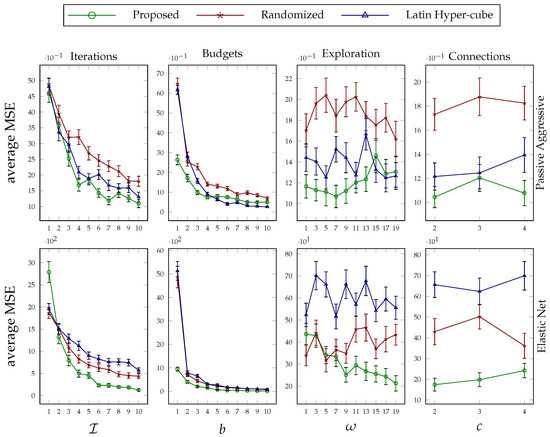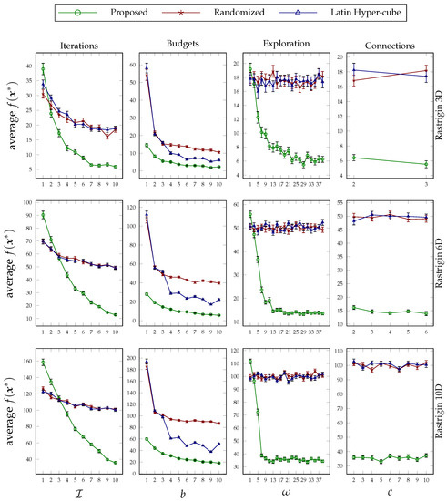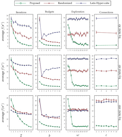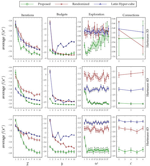 The behavior of the suggested method under various exploration parameter values can be seen in column 3 of Figure 3 and Figure 4. The values on the x-axis of the plots are used to set the initial value for the slot width parameter of all agents using . Based on this configuration, higher values of yield lower values of , and as a result, there is more exploitation around the starting coordinates. The other parameters of the method are configured as follows: . Recall from Section 2 that the exploration parameter is used by an agent for the dimensions that it does not represent. Based on the results obtained from various tasks, choosing a proper value for this parameter depends on the characteristics of the response function. Having said that, the behavior for a particular task remains almost consistent. Hence, trying one small and one large value for this parameter in a specific problem will reveal its sensitivity and help choose an appropriate value for it.