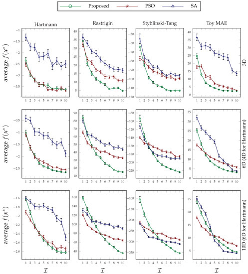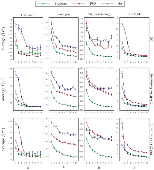 The results exhibited in Figure 10 show the behavior of the tested optimization algorithms under various budget restrictions. In this set of experiments, we have fixed the number of iterations to , and the results show a promising success of our method in outperforming the other two in most problems. Similar to the rationale provided above, the amount of improvement in Rastrigin and Styblinski–Tang functions is evident. Moreover, our method also shines when we have a low budget for the number of evaluations in each iteration. In other words, it can be a good candidate for optimizing expensive-to-evaluate problems or its use in computationally limited devices.