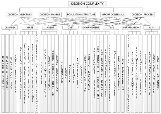 The decision-making complexity of MSTPs has many factors and various forms of expression based on different perspectives. The source of its complexity requires not only considering factors such as progress, quality, cost, and risk, but also considering factors such as coordination with the environment and sustainable development. At the same time, it is necessary to achieve a coordinated balance of constraints such as demand, quality, cost, schedule, risk, resources, information, and environment based on the overall goal and overall interests of the project. There are many factors and forms of complexity in decision making in MSTPs. Below, we investigate the evaluation index system of decision complexity. Studying decision complexity mainly involves identifying the sources of complexity. The sources of decision complexity should firstly be analyzed from the constituent elements of the decision-making system, and secondly from the perspective of engineering management. On this basis, our two research perspectives are formed. We first construct the top nodes from the perspective of the main components of decision-making systems, including decision objectives, decision makers, population structure, group consensus, and decision process. Next, we construct middle nodes from the perspectives of engineering management, including demand, mass, agent, cost, environment, time, information, and risk. Lastly, we refine and decompose the middle nodes from the perspective of measures, and then construct the lower nodes. In summary, we construct a multiscale decision-making complexity evaluation index system that involves micro, meso, and macro factors. The decision complexity measurement model of MSTPs is shown in Figure 1.