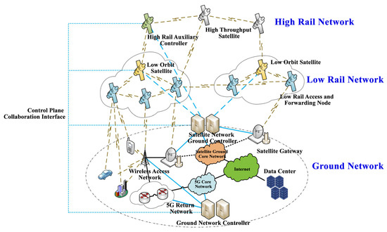 The selected case was the space–ground integrated information network sourced from one of the MSTPs in China’s technological innovation . The space–ground integrated information network is composed of a high-rail network, low-rail network, and ground network, and is interconnected with ground internet and mobile communication networks to establish a “global coverage, on-demand access, on-demand service, and secure and reliable” integrated information network system, as shown in Figure 3. After completion, it will enable China to have global spatiotemporal continuous communication, highly reliable and secure communication, regional high-capacity communication, and high-mobility full-range information transmission capabilities. Obviously, the space–ground integrated information network is a complex system that covers multiple hierarchical elements such as systems, subsystems, devices, modules, and components. Among them, system-level elements refer to the space–ground integrated information network. Subsystem-level elements include the high-orbit network, low-orbit network, and ground network. Device-level elements include various satellites in the high-orbit network, as well as satellite stations and operation control centers in the ground network. Module-level elements include various satellite platforms, payloads, and ground base station equipment, while component-level elements refer to the basic components at the lowest level.