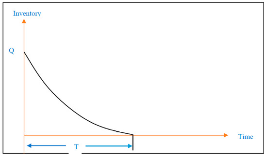 Before describing the fuzzy environment-based analysis, let us describe the EOQ model in a crisp environment. The retailing scheme starts with the lot size , and with meeting the customer demand at the rate , the stock is going through gradual decay. The retailing cycle is ended at time , fulfilling the total demand during the span of the retailing cycle without any shortage. In the literature on inventory models, there are similar types of schematic diagrams depicting the inventory level across the retail cycle or manufacturing cycle. The whole lot sizing procedure is presented in Figure 3. We designed this figure to illustrates the scenario approximately. Then, the inventory level at any time in the retailing time interval is given as follows: