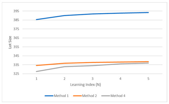 - The lot increases with the learning index when using each method. The largest lot size is obtained using method 1, while the smallest corresponds to method 4.