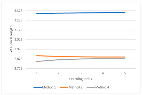 - The total cycle length increases with the learning index when using method 1 and method 4. The graph of the total cycle length shows the reverse pattern for method 2. The largest lot size is obtained using method 1, while the smallest corresponds to method 4.