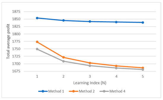 - The total average profit decreases with the learning index when using each method. The best result corresponds to method 1.