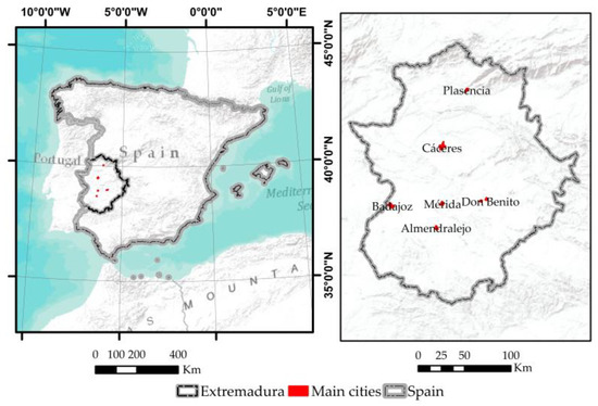 The study focuses on Extremadura, which is an autonomous community located in the interior of Spain. It is made up of two provinces, Cáceres and Badajoz, although rural tourism takes on greater dimensions in the former. It shares a border with Portugal, the oldest border in Europe [46]. It also borders with other autonomous communities within the country such as Castilla y León, Castilla-La Mancha, and Andalusia (Figure 1).