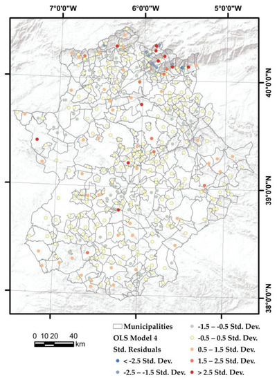 Although the regressions used (OLS, GWR, and MGWR) have common characteristics and objectives, they also exhibit marked differences, mainly due to the consideration of the neighborhood criterion. Ordinary least squares regression is perhaps that offering the simplest configuration, while at the same time, it has a long history in various scientific publications. Sometimes, it is used as a stand-alone technique, although in other situations it is used in conjunction with other methods of statistical analysis [66,67]. Its main objective is to obtain a suitable model with which to establish predictions on the basis of a previously defined set of independent variables.