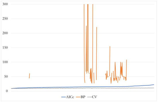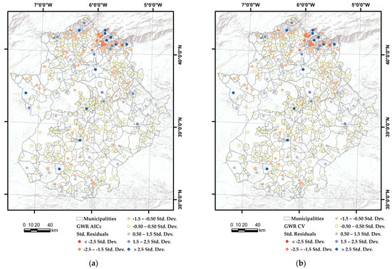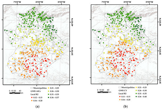 To address this context, spatially weighted regression (GWR) has emerged as a viable alternative for building models in which spatial relationships are effectively considered. This allows the construction of a model using explanatory variables, just like OLS. GWR specifies whether the kernel is constructed following a fixed distance, or whether it is allowed to vary in width depending on the density of the attribute under analysis [78,79]. It also makes it possible to determine the extent of the kernel, either by means of the Akaike corrected criterion (AICc), cross validation (CV), or the bandwidth parameter (Bandwidth Parameter).