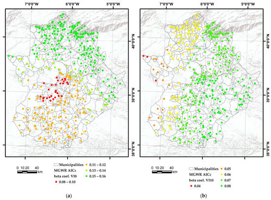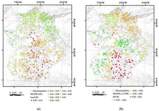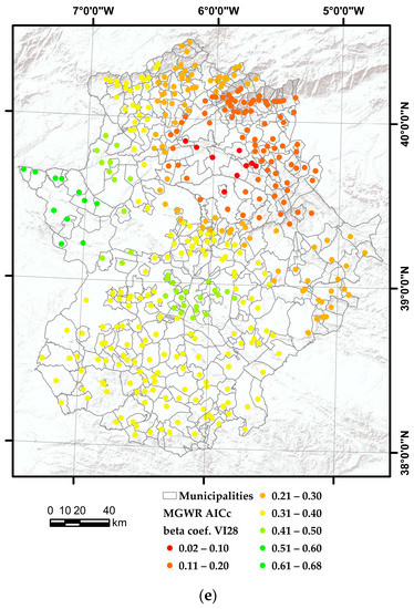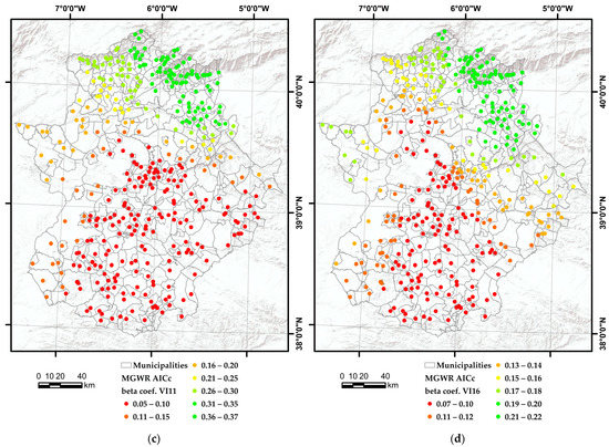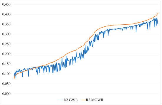 This type of regression assumes that all the relationships of the independent variables that make up the model vary in space, but are always on the same spatial scale, which can influence the results. For this reason, an increasing number of specialists have opted for the application of multiscale geographically weighted regression (MGWR), as it allows the relationships established between the independent variable and the regressors to mutate at different spatial scales. This de facto implies that the distance used can vary according to the type of surfaces involved in the model [69].