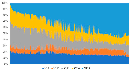 Although the number of trials performed was high, this allowed the variables to be refined in consideration of their significance, the variance inflation factor (VIF), and the number of multicollinearity violations. Most of the proposed variables were demonstrated on the basis of their statistical significance to be acceptable values, as also suggested by their variance inflation factors (VIFs). Only proximity to the mountain (VI1) possessed a high value that exceeded the permitted threshold. However, this variable was still regarded as acceptable, since variables were only to be discarded when a value of 7.5 was exceeded.