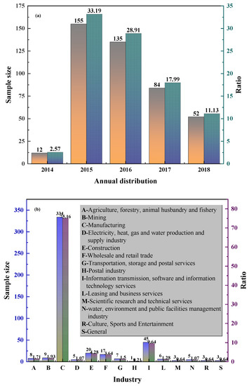 Figure 1a shows the annual distribution of employee stock ownership plans. The number of samples implementing employee stock ownership plans was the largest in 2015, reaching 155, and the number of samples implementing employee stock ownership plans decreased year by year from 2016–2019. From the industry distribution in Figure 1b, manufacturing is the industry with the largest number of employee share ownership plans implemented, accounting for 75.16% of the total sample, followed by information transmission, software, and information services, accounting for 9.64% of the total sample.