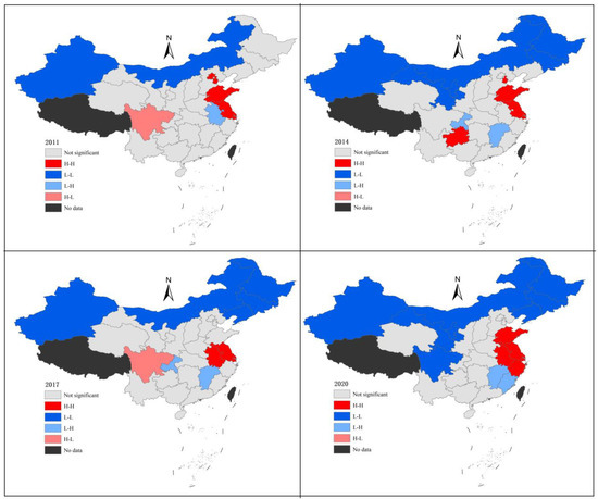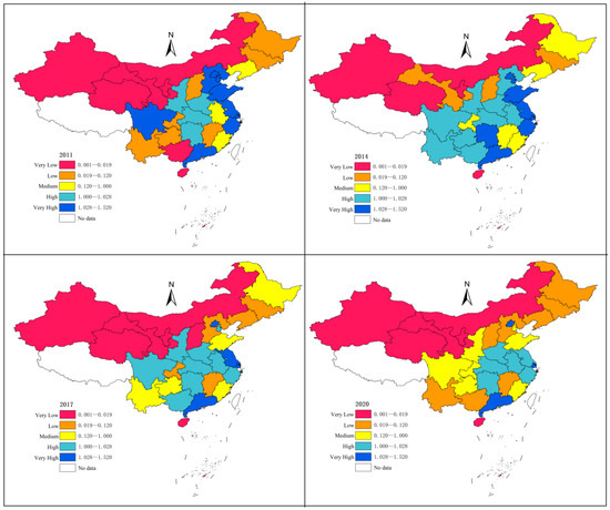 To compare the geospatial layout and change characteristics of China’s new infrastructure input efficiency level, with the support of the ArcMap 10.5 software, the natural breakpoint method was used to compare 2011, 2014, 2017, and 2020. For 2020, the input efficiency of new infrastructure in the 30 provinces in China was graded and visualized. The natural breakpoint method is helpful to analyze the efficiency and structural distribution of new infrastructure investment, reflecting regional spatial differences, as shown in Figure 2 [73,74,75].