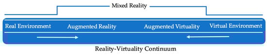 While AR and VR technologies are closely related, they offer different approaches to interacting with reality and virtuality. While AR technologies overlay virtual information onto the real world and allow users to interact with both real and virtual content, VR technologies transport the user to a virtual environment with the aim of fully immersing them in that world [27,28]. Mixed reality (MR) blends both types of interaction within a single object. Milgram and Kishino [28] first proposed the reality–virtuality continuum—a central model for understanding AR/VR that introduced the MR construct. Their model proposed an approach to categorizing different MR display systems based on a taxonomy of key factors (see Figure 1). AR and VR may be viewed as lying at opposite ends of the reality–virtuality continuum [2]. For the user, the difference lies in the level of immersion [8]: in AR, the perspective of the user remains primarily that of the real world, while in VR, the user is wholly immersed in a virtual environment.