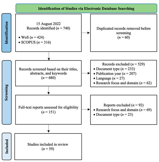 The electronic search yielded 740 records at the identification stage. MS Excel and EndNote X9 software were employed to organize and manage the identified records, and 60 duplicated records were discarded through EndNote X9. At the screening stage, we followed five manuscript selection criteria: (a) document type: the study was published in a peer-reviewed journal and presented empirical data; (b) language: the study was written in English; (c) publication year: the study is quite recent and incorporates most recent technological developments—we therefore restricted the publication interval to the last five years (2018–2022); (d) domain: the study was carried out in the field of mathematics education; and (e) research focus: the study provided empirical results on the benefits or drawbacks of AR/VR technology for mathematics learners. Based on these criteria, we screened the titles, abstracts, and keywords of 680 studies, and then examined the full texts of 151 papers. In the final step, the eligibility check ensured the inclusion of 59 papers in the present systematic review (see Figure 2).