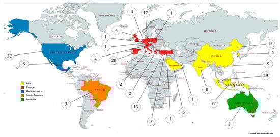 An analysis was conducted on the country affiliations of all authors (n = 202) to determine the global outlook on the researchers’ contributions to the implementation of AR/VR in mathematics education. Our analysis observed a diverse set of contributors to this research area, with 25 different countries being represented (see Figure 4). The numbers/figures displayed on the world map in Figure 4 represent the quantity of researchers from each country who are making contributions to the field. Researchers from Asia (45%, n = 90) and Europe (33%, n = 66) are the dominant contributors to the field. North America is the third largest contributor (20%, n = 40), followed by South America (1%, n = 3) and Australia (1%, n = 3).