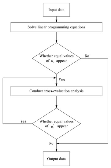 When is the evaluation index, in most cases, relatively complete evaluation results can be obtained. However, in special situations, the same value of may also occur, which cannot offer complete evaluation results. As a result, should be chosen as the second evaluation index. In view of the possibility that may have the same value, another cross-evaluation should be conducted. The new optimal solutions and should be used to calculate the efficiency value of other bidding units to obtain a new cross-evaluation matrix. The second cross-evaluation is referred that the average value of non-diagonal elements in column is used as the evaluation index (the evaluation index of the second cross-evaluation is expressed by ). The calculation process of DEA model with cross-evaluation mechanism is shown in Figure 1.