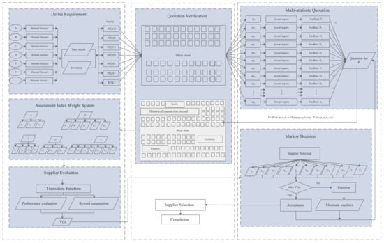 The e-procurement system includes six modules, and the three for demand enterprise are Define Requirement, Assessment Index Weight System, and Supplier Evaluation. In addition, the two for suppliers are Multi-attribute Quotation and Markov Decision. Module Quotation Verification is used to verify suppliers’ information utilizing Blockchain. The process begins in the Define Requirement module, where an elderly product-manufacturing enterprise puts forth a request for quotes.