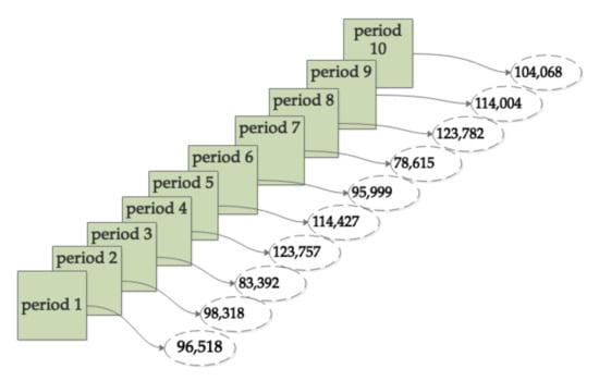 The procurement decision depends on the state of the current period and has no direct bearing on the states of earlier periods; in other words, it is random and has “no after effect”, which is in accordance with MDP requirements. Based on this and previous research [,], this paper resolves the problem by an improved MDP model and uses a dynamic programming algorithm to calculate the optimal decision path of the entire periods. s refers to the state of the current period, which represents the initial state in the MDP. I, Q, C, t, and k are variables in the transaction. I denotes the set of orders that should be delivered in the tth period, Q refers to the set of supplier quotations in the current state that demand enterprises may choose from, C refers to other cost-excluding product costs in the current period and k is demand enterprises’ original inventory level. As soon as a transaction is complete, state s is transferred to the next state s’, and receives I’, Q’, t’, and k’.