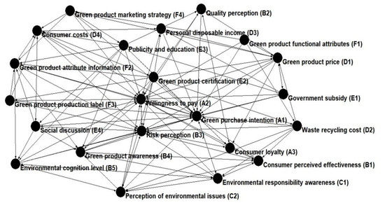 Table 9. We considered factors with betweenness centrality greater than 0.1 as the critical intermediary nodes. It was clear that green purchase intention (A1, 0.352), consumer cost (D4, 0.284), green product certification (E2, 0.244), and green product price (D1, 0.148) were the critical intermediary nodes.