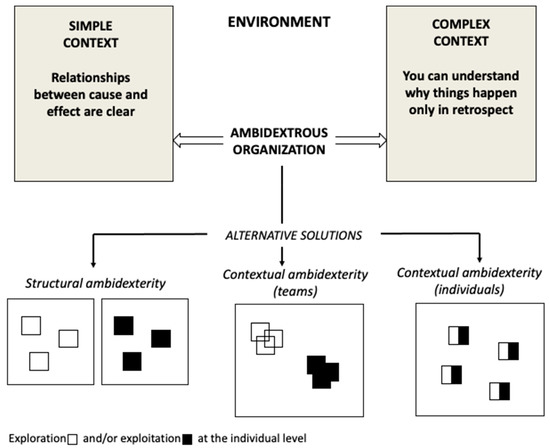 We find the same polarity (i.e., simple vs. complex contexts) at the heart of the studies on organizational ambidexterity [38]. More specifically, we are referring to those studies—prevalent in the literature on organizational ambidexterity [39,40]—that closely associate this ability or better dynamic capability [41] with the classic dichotomy proposed by March [42] between exploration (coupled with complex contexts) and exploitation (coupled with simple contexts). In line with March’s original definition, exploitation means not only exploitation of already available knowledge, but also incremental improvements and innovations [43].