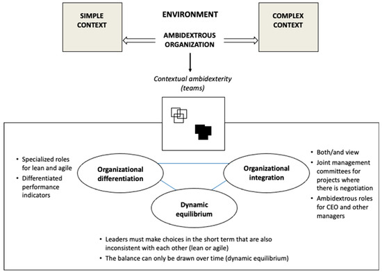 In short, an ambidextrous organization simultaneously exploits existing knowledge to make incremental improvements (what is called exploitation) and creates new knowledge by generating product, process, or business model innovations that break with the past (what is called exploration). The binomial exploitation–exploration qualifies as a paradox since the two forces of exploitation and exploration are in contradiction with each other even if over time they can be synergistic. Recognizing, accepting, and managing the paradox enables the firm to move in a multi-context environment in terms of (external) complexity. At the same time, the ambidextrous firm has an internal complexity that comes not only from exploring the most challenging and risky contexts, but also from managing exploration in close association with exploitation. It is within this framework that, following Lewis, Andriopoulos, and Smith [63], we can place the lean–agile dichotomy.