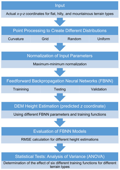A general flowchart of the FBNN pipeline for DEM height estimation and evaluation is shown in Figure 1. Section 2.1 describes input data. Section 2.2 describes the point processing to create different distributions. Section 2.3 describes the normalization of the input parameters, FBNN training, testing and validation, DEM height estimation using different FBNN parameters and training functions, and evaluation of FBNN models using RMSE calculation. Section 2.4 describes a statistical test (ANOVA) for the determination of the effect of six different training functions for different terrain types. Finally, Section 2.5 describes the software used in this study.