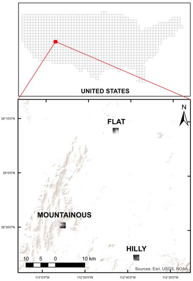 Geographic location of three different DEMs used in this study for flat, hilly, and mountainous terrains in the United States.