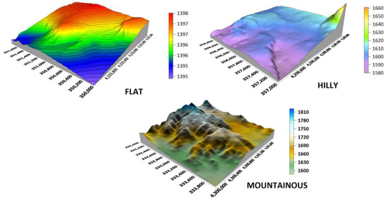 The 3D Models of the study areas (Top left: hilly, Top right: flat, and Bottom: mountainous).