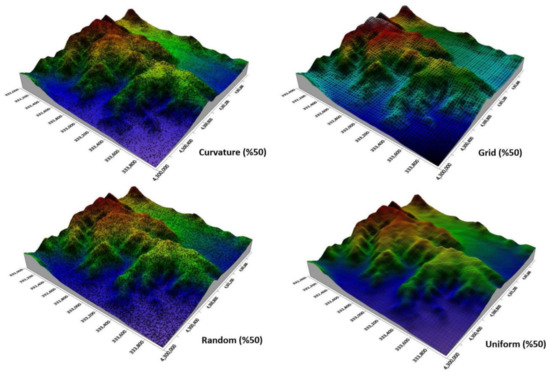 The grid distribution reduces the number of points in an irregular point space without considering the curvature and the original density of the pattern. However, the curvature distribution reduces the number of points on surfaces that are very close in height but preserves the detail in areas of high slope. The uniform distribution evenly reduces the number of points on surfaces whose heights are very close to each other but reduces the number of points on curved surfaces to a certain density. Random distribution removes a random percentage of points from an irregular point space. A 3D model of the grid, curvature, random, and uniform distributions of the points of the mountainous area is given in Figure 4.