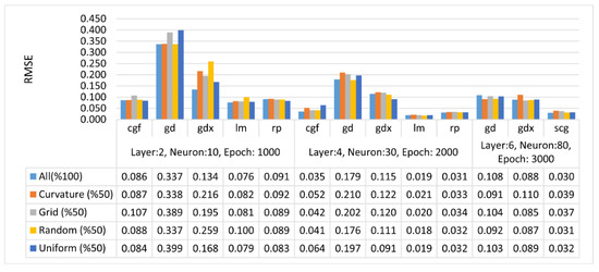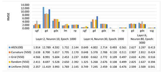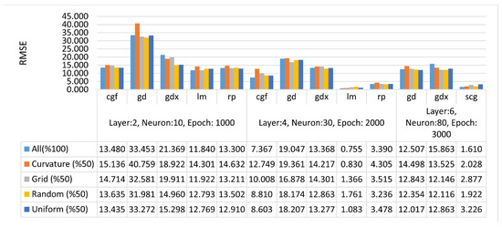 In this study, RMSE values were calculated based on the differences between the predicted height of the FBNN and the target output height. Specifically, comparisons were made to determine the performance of the FBNNs in the height estimation for different terrain types and distributions with different ANN parameters. Figure 7, Figure 8 and Figure 9 present comparisons of RMSE values obtained from different FBNN parameters based on different terrain types and point distributions. For flat terrain, the RMSE was within a centimeter, and for hilly or mountainous terrain, within a meter. It was observed that as the number of layers, neurons, and epochs increased in different terrain types and distributions, the RMSE values decreased. Generally, the training function trainlm gave the best result, whereas traingd and traingdx functions gave the worst results. Furthermore, the accuracy of the interpolation for flat terrain was the best, whereas the mountainous was the worst. In the comparisons of RMSE values, the performance of both traingd and traingdx was lower than the others. However, for the training function traingd, the maximum number of iterations was performed, whereas the minimum number of iterations was performed using the training function traingdx. Therefore, the optimum number of epochs can vary depending on the complexity of the network or the size of the training data set.