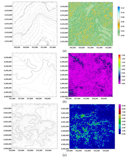 For example, the RMSEs for the FBNN model using trainlm training function, which has four hidden layers with 30 neurons each, were 0.02 m, 0.13 m, and 1.45 m, for the grid point distributions on flat, hilly, and mountainous terrains, respectively. The contours obtained from ground truth and spatial distributions of height errors in meters have been illustrated in Figure 10. It was observed that elevation errors increase dramatically on the skeleton lines of the terrain (ridges and drainage lines), as well as at sink and peak points. Since the mountainous terrain has more ridges and drainage lines than the flat terrain, RMSE for the mountainous terrain were higher than that of the flat terrain.