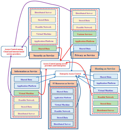 In Figure 1, the red colored arrow lines represent the various fundamental property to frame the access control among service providers and enterprises through the services such as shared data in the form of security as service, application platform, and supporting services in the form of privacy as service; and feasibility network, stored data, and distributed server in the form of hosting as service. The blue colored arrow lines represent the various fundamental properties that frame the enterprise access control through the services such as shared data in the form of privacy as service; virtual machine, application platform, and shared data in the form of hosting as service; application platform and shared data in the form of hosting as service; and application platform, shared data, virtual machine, stored data, and feasible network in the form of IT resource as service. The violet colored arrow lines represent the various fundamental properties that frame the access control among cloud and Internet-based service providers through the services such as stored data, feasible network, and distributed servers in the form of the information as service, application platform, virtual machine, stored data, viable network, and distributed server in the form of the security as service; and stored data, feasible network and distributed server in the form of the privacy as service. Library updates can be challenging since other projects and applications rely on them. Even minor modifications to the library can cause issues with other projects’ codes.