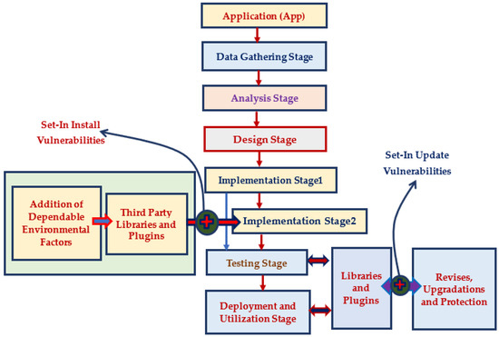 In Figure 2, the brown arrow lines represent the step-wise process of software application development, implementation, testing and deployment stages. The indigo arrow lines represent various vulnerabilities’ entry levels at cloud-based software application installation and upgrade stages. The bi-directional arrow lines represent the correlation among multiple libraries and plug-ins required during software application testing and deployment stages. The red arrow lines represent the execution flow among the third-party libraries with their additional dependable factors and software application development stage.