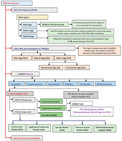 The software developers employ the CPF’s mobile development (CPMD) resolutions to build up mobile-based applications once, and it is expected to run or deploy on many platforms and devices. The numerous CPF solutions (CPS) are unmoving under consideration of the research process and development process. These CPS build based on different methods and approaches, such as the WbA, Cross-Compilation-based approach, and Virtual-Machine-based approach (VMbA), as shown in Figure 3.