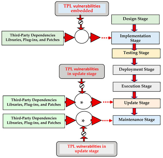 In Figure 4, the brown arrow lines represent pro-step-wise stages. The thin brown arrow lines represent the correlation among the third-party libraries, plug-ins, and the software development stages of implementation, updating, and maintenance. The red colour arrow represents the entry points of third-party vulnerabilities.
